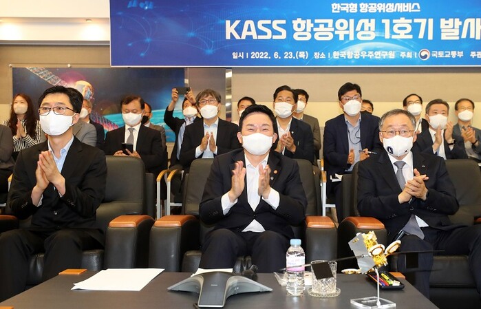 이날 원희룡 국토부 장관은 대전에 위치한 항공우주연구원 위성관제실을 찾아 항공위성 1호기 발사 생중계 상황을 직접 참관하고 연구진 등 관계자들을 격려했다.