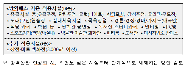 대규모 점포가 추가로 적용시설에 포함됨에 따라, 방역패스 적용 대상 시설은 식당·카페, 유흥시설, 노래연습장, 실내체육시설, 영화관·공연장 등 기존 16종 시설이 총 17종으로 늘어나게 됐다.