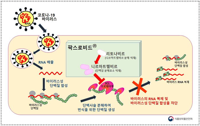 | ▲ 미국 화이자 사의 먹는 코로나19 치료제 '팍스로비드'의 작용기전 모식도. [식품의약품안전처 제공] |