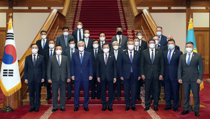 ▲ 문재인 대통령이 17일 청와대에서 한-카자흐스탄 주요 경제인 간담회를 마치고 토카예프 카자흐스탄 대통령 등 참석자들과 기념사진을 촬영하고 있다. 앞줄 왼쪽부터 문승욱 산업자원부 장관, 구자열 무역협회장, 토카예프 대통령, 문재인 대통령, 무타르 클레우베르디 카자흐 부총리 겸 외교부장관, 알마사담 사트칼리예프 삼룩카즈나 회장, 카낫 보줌바예프 카자흐 대통령 보좌관, 티무르 술래이메노프 카자흐 대통령실 부실장. |