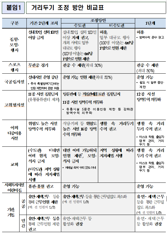 ▲ 거리두기 조정 방안 비교표 [출처= 중앙재난안전대책본부] |