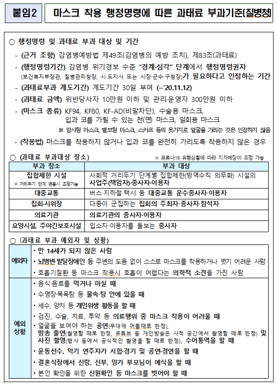 또 불특정 다수가 이용함에 따라 감염 확산의 우려가 있는 대중교통, 집회·시위장이나, 감염 취약계층이 많은 의료기관, 요양시설, 주야간 보호시설에는 마스크 착용을 의무화하고, 계도기간을 거쳐 11월 13일부터 위반자에 대해 과태료를 부과한다.