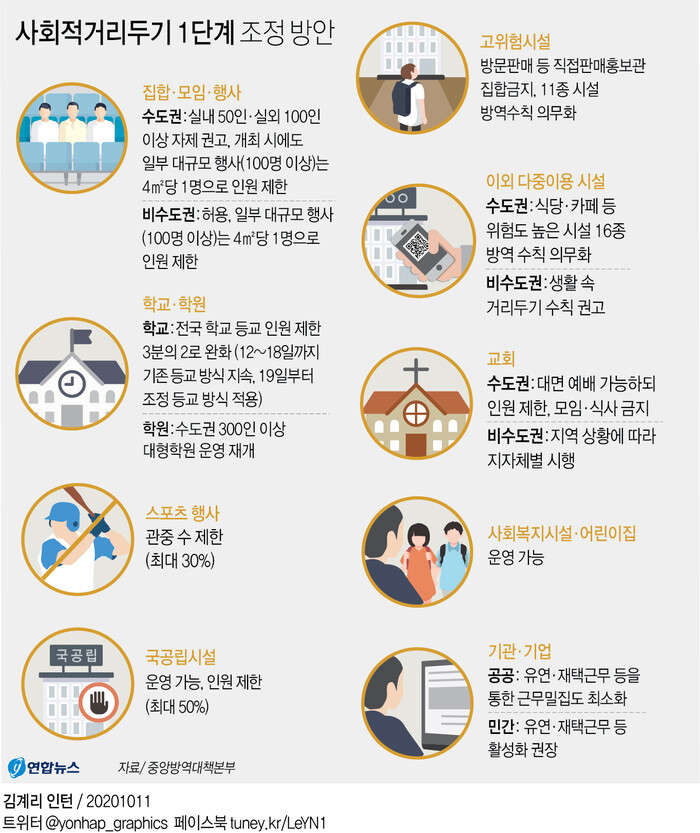 ▲ 사회적 거리두기 1단게 조정 방안. [그래픽= 연합뉴스] |