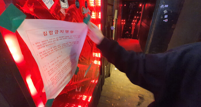 ▲ 12일 새벽 서울 한 클럽에서 관계자가 집합금지 안내문을 떼고 있다. 정부는 이날부터 코로나19 방역 대응 '사회적 거리두기'를 2단계에서 1단계로 조정했다. 수도권의 경우 ▲ 클럽·룸살롱 등 유흥주점 ▲ 콜라텍 ▲ 단란주점 ▲ 감성주점 ▲ 헌팅포차 ▲ 노래연습장 ▲ 실내 스탠딩 공연장 ▲ 실내집단운동(격렬한 GX류) ▲ 뷔페 ▲ 대형학원(300인 이상) 등 10종의 고위험시설에 대한 집합금지 조처가 해제됐다. [사진= 연합뉴스] |