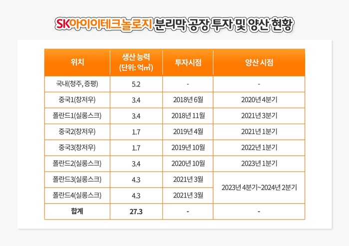 SKIET는 국내 충북 증평과 중국 창저우 등에서 약 8억 6000㎡ 규모 생산능력을 확보해 공장 가동 중이다. 폴란드 실롱스크와 중국 창저우에 짓고 있는 신규 공장이 순차적으로 가동하면 올해 말 생산능력이 약 13억 6000㎡로 늘어난다. 이번 폴란드 3, 4 공장 투자로 2024년이면 생산능력이 27억 3000㎡에 이르게 된다.