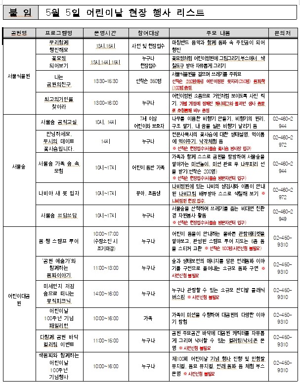 ▲ 5월 5일 어린이날 서울식물원, 서울숲, 어린이대공원 현장 행사 리스트. [서울시 제공] |