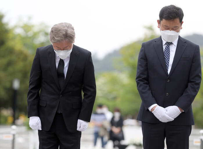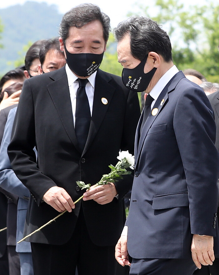 ▲ 23일 오전 경남 김해시 진영읍 봉하마을에서 열린 노무현 전 대통령 서거 12주기 추도식에서 헌화를 마친 정세균 전 총리(오른쪽)가 헌화 순서를 기다리는 이낙연 전 총리 앞으로 이동하고 있다. [김해=연합뉴스]