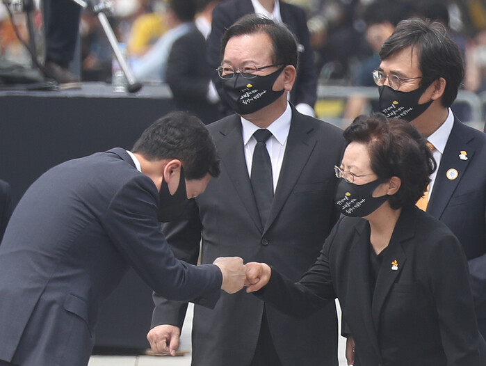 ▲ 권양숙 여사(오른쪽)와 김기현 국민의힘 원내대표 겸 당 대표권한 대행이 23일 오전 경남 김해시 진영읍 봉하마을에서 엄수된 노무현 전 대통령 서거 12주기 추도식에서 주먹인사 하고 있다. [김해=연합뉴스]