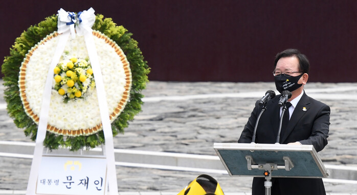 ▲ 김부겸 국무총리가 23일 오전 경남 김해시 진영읍 봉하마을에서 엄수된 노무현 전 대통령 서거 12주기 추도식에서 추도사하고 있다. [김해=연합뉴스]
