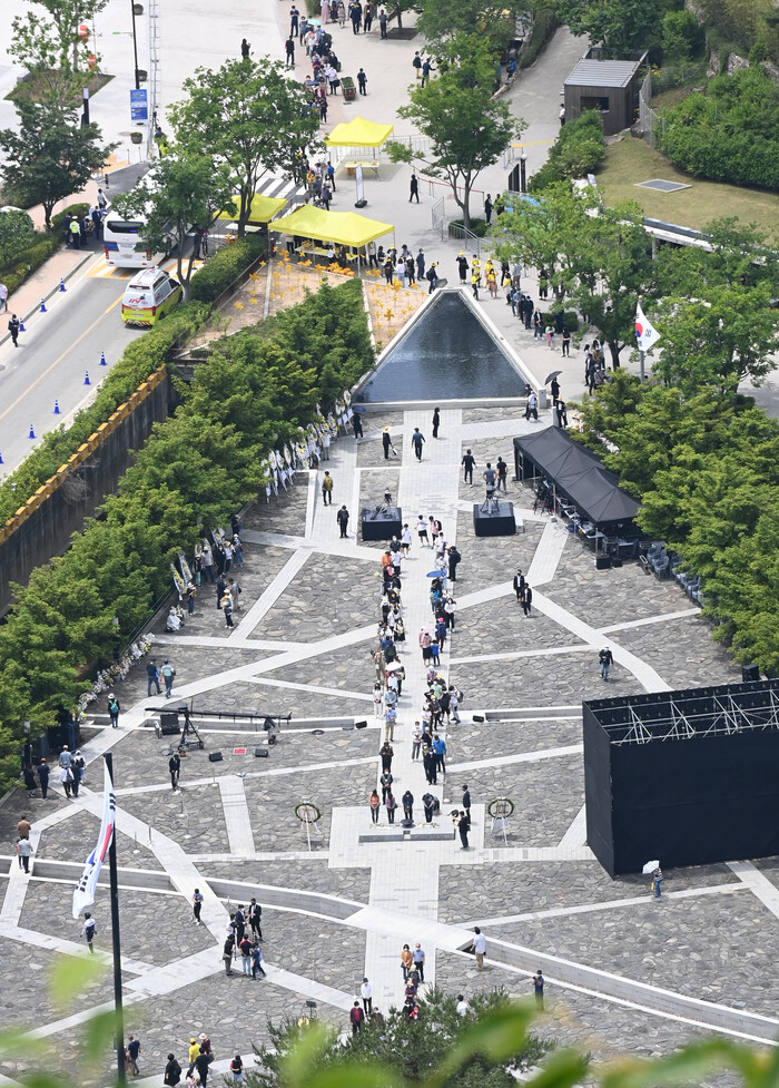 ▲ 권양숙 여사 등 참석자들이 23일 오전 경남 김해시 진영읍 봉하마을에서 엄수된 노무현 전 대통령 서거 12주기 추도식에서 참배하고 있다. [김해=연합뉴스]