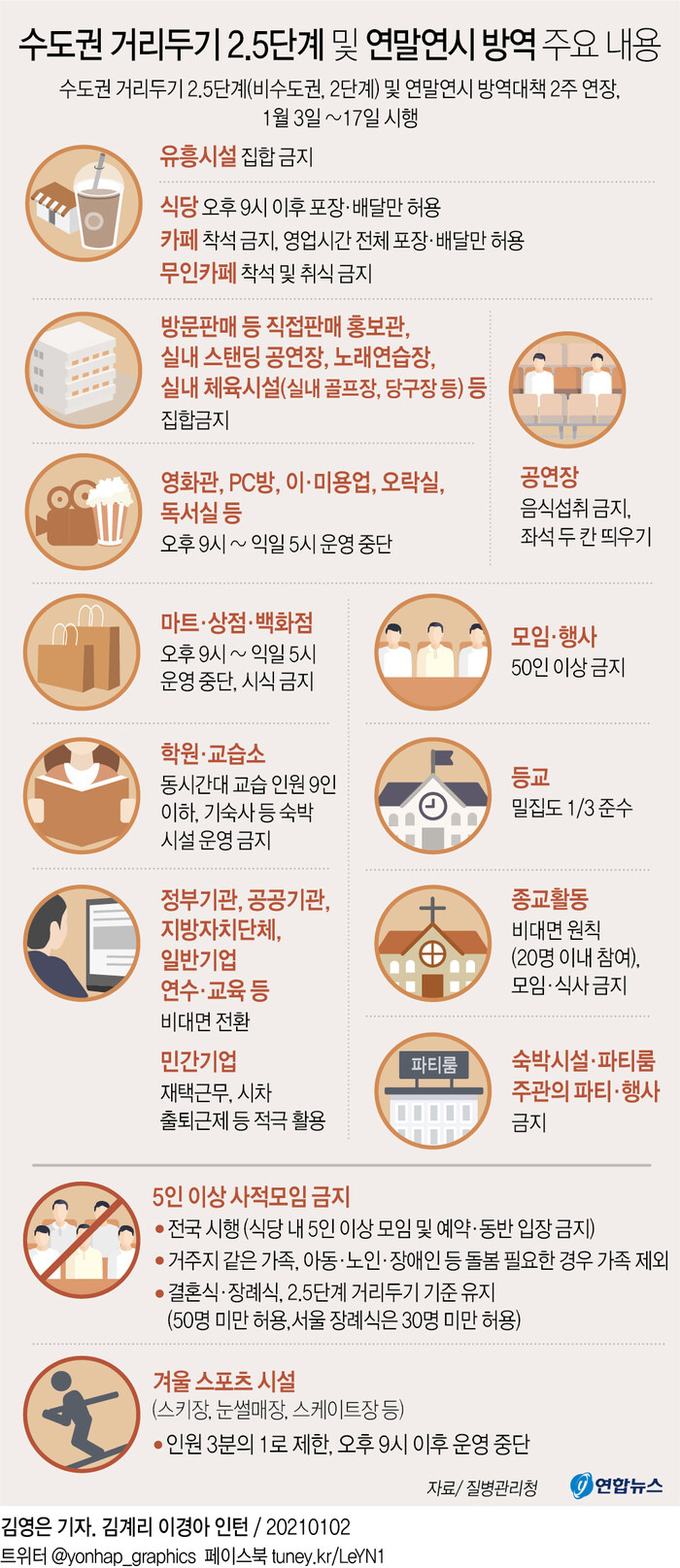 ▲ 수도권 거리두기 2.5다계 및 연말연시 방역대책 주요 내용. [그래픽= 연합뉴스] |