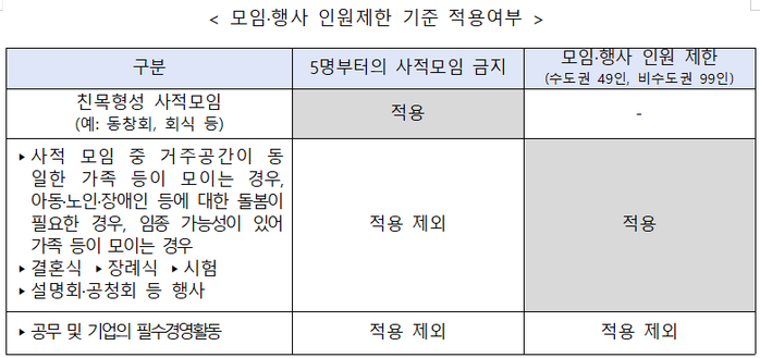 ▲ 모임·행사 인원제한 기준 적용여부. [출처= 중앙재난안전대책본부] |