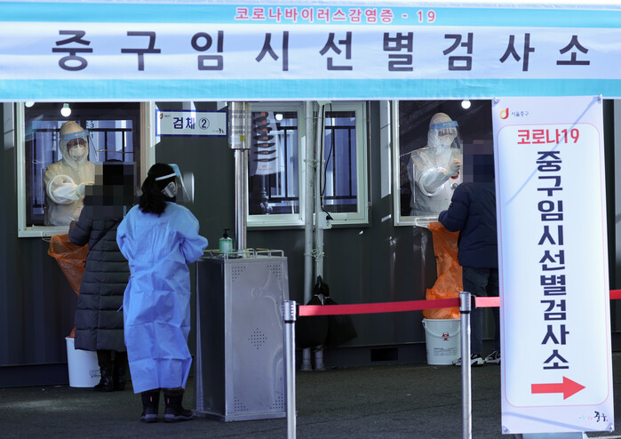 ▲ 2일 오후 서울역 광장에 마련된 코로나19 중구 임시 선별검사소에서 의료진이 시민들의 코로나19 검체를 채취하고 있다. [사진= 연합뉴스] |