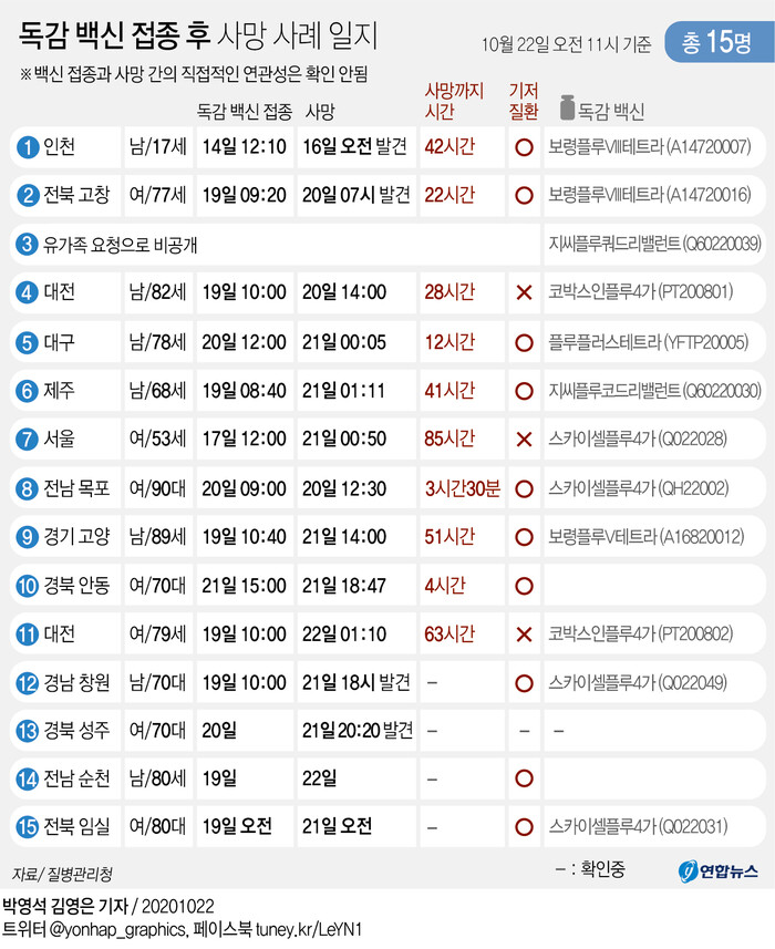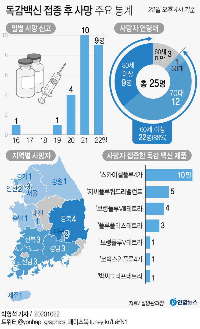 ▲ 질병관리청은 22일 오후 4시 기준으로 독감백신 접종 후 사망자가 총 25명으로 집계됐다고 밝혔다. [그래픽= 연합뉴스] |