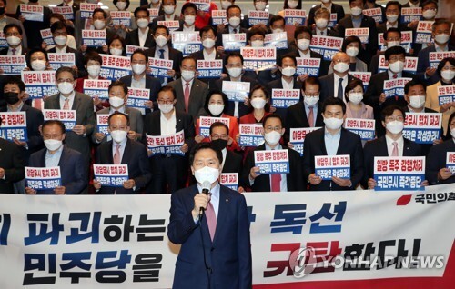 국민의힘은 이날 여당이 김부겸 국무총리 후보자 인준과 임혜숙 과기정통부, 노형욱 국토부 장관 후보자의 인사청문 경과보고서 채택을 일방 처리하자 강력히 규탄했다.