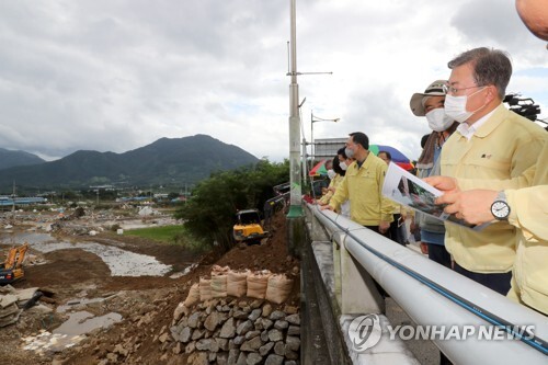 ▲ 문재인 대통령이 12일 오후 전남 구례군을 방문, 집중호우로 유실된 제방 및 도로를 둘러보고 있다. [구례= 연합뉴스] |