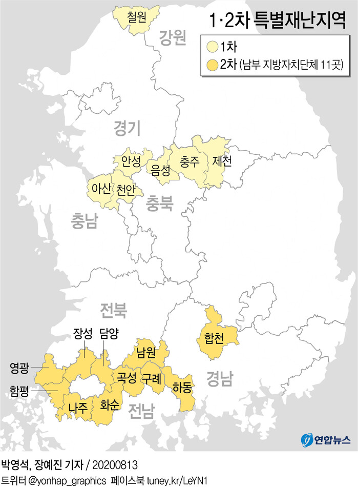 ▲ 문재인 대통령은 13일 최근의 집중호우로 심각한 피해를 본 남부지방 지방자치단체 11곳을 2차 특별재난지역으로 선포했다. [그래픽= 연합뉴스] |