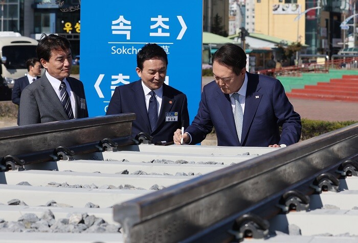 | ▲ 윤석열 대통령이 18일 오전 속초 엑스포 잔디광장에서 열린 '춘천~속초 동서고속화철도' 착공 기념식에 참석해 침목에 서명하고 있다. [속초=연합뉴스] |
