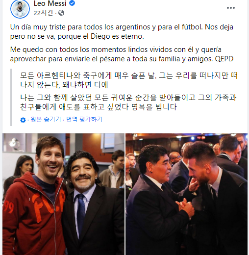 메시는 "아르헨티나 국민과 축구계에 매우 슬픈 날"이라며 "그는 우리를 떠나지만 떠나지 않는 것이기도 하다. 디에고는 영원하기 때문"이라고 썼다.