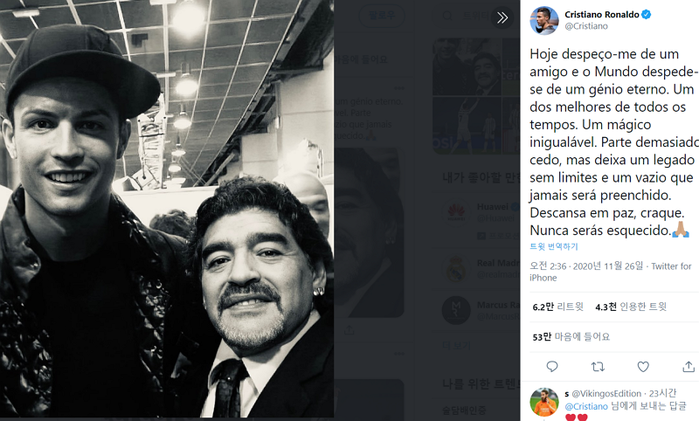 포르투갈 출신 축구 스타 크리스티아누 호날두(유벤투스)도 자신의 트위터에 마라도나와 나란히 찍은 사진을 올리며 고인을 기억했다.