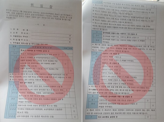 | ▲ 찬반표기가 미리 작성된 회사측 위임장 용지 [사진=박철완 상무 제공] |