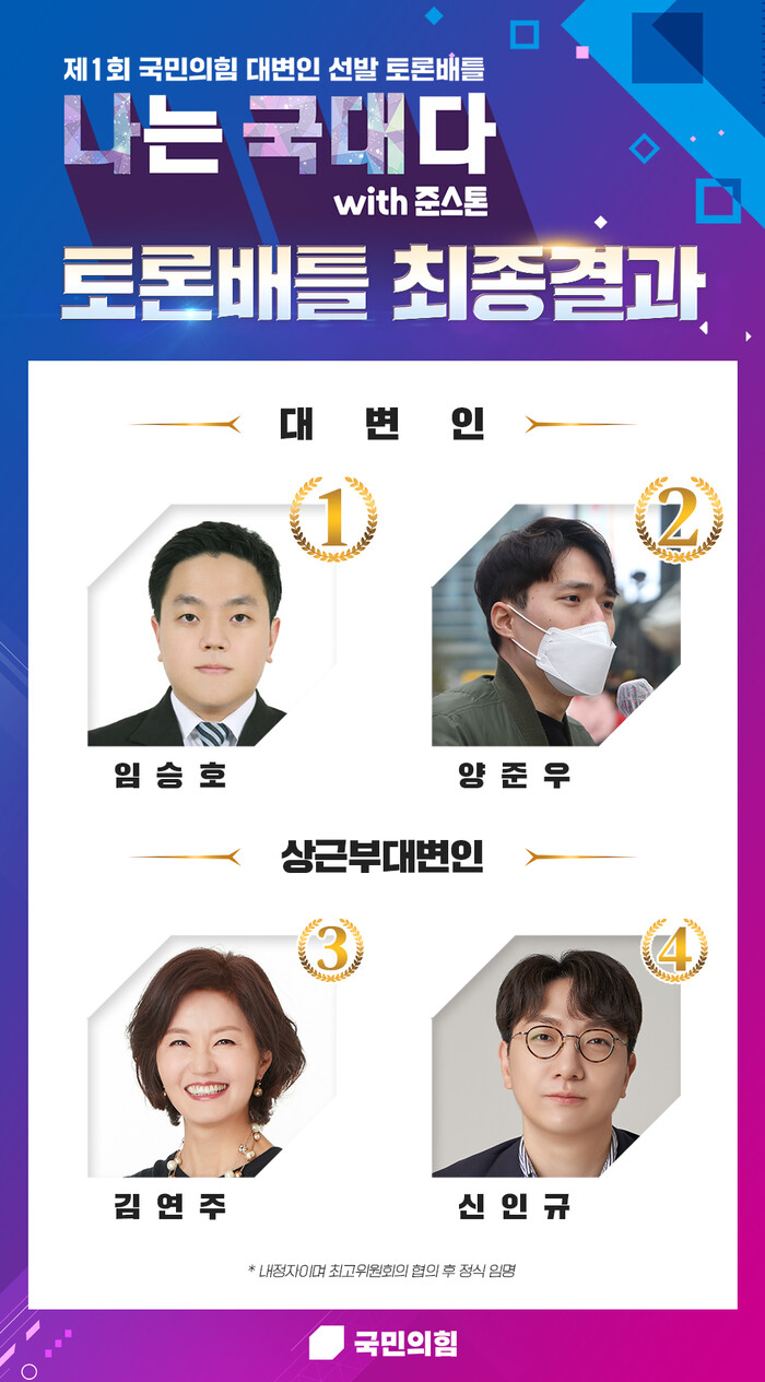 ▲ 제1회 국민의힘 대변인 선발 토론배틀 '나는 국대다' 결승전서 90년대생인 임승호 씨와 양준우 씨가 1,2위를 차지해 대변인이 됐다. 3,4위를 차지한 아나운서 김연주 씨와 변호사 신인규 씨는 상근부대변인으로 활동한다. [출처=국민의힘] |