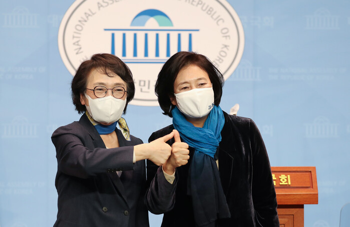 ▲ 더불어민주당 박영선 서울시장 후보(오른쪽)가 17일 국회 소통관에서 열린민주당 김진애 후보와의 단일화 경선에서 승리한 뒤 함께 엄지 손가락을 들어보이고 있다. [서울= 연합뉴스] |