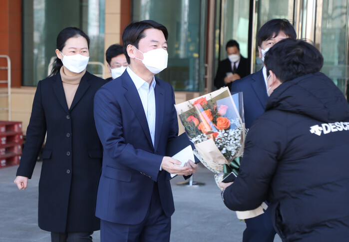 ▲ 국민의당 안철수 대표가 20일 오전 서울시장 보궐선거 출마 선언 기자회견을 마친 뒤 서울 여의도 국회 소통관을 떠나며 지지자의 꽃다발을 받고 있다. [사진= 연합뉴스] |