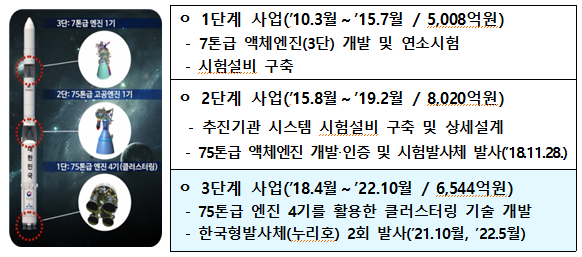 1단계 사업(2010년 3월~2015년 7월, 5008억원)을 통해 7톤급 액체엔진(3단) 개발 및 연소시험, 시험설비구축이 진행됐고, 2단계 사업(2015년 8월~2019년 2월, 8020억원)을 통해서는 추진기관 시스템 시험설비 구축 및 상세설계, 75톤급 액체엔진 개발·인증 및 시험발사체 발사가 이뤄졌다.