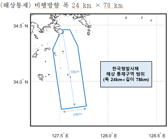 ▲ 비행방향 폭 24km × 78 km의 해상통제 구역. [과학기술정보통신부 제공] |