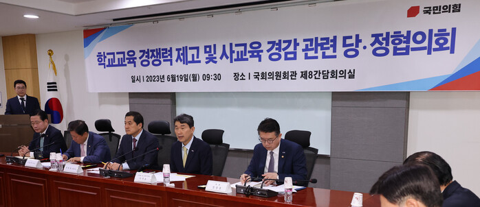 | ▲ 국민의힘과 정부는 19일 국회에서 학교교육 관련 당정협의회를 열고 대학수학능력시험(수능)에서 이른바 '킬러 문항'(초고난도 문항) 출제를 배제하고 수능의 적정 난이도 확보를 위해 출제 기법 등을 점검하기로 했다. 당정은 또 학생들의 소질과 적성에 맞는 맞춤형 교육을 실시하는 차원에서 문재인 정부에서 폐지키로 결정했던 자사고, 외국어고, 국제고를 존치하기로 했다. [서울=연합뉴스] |