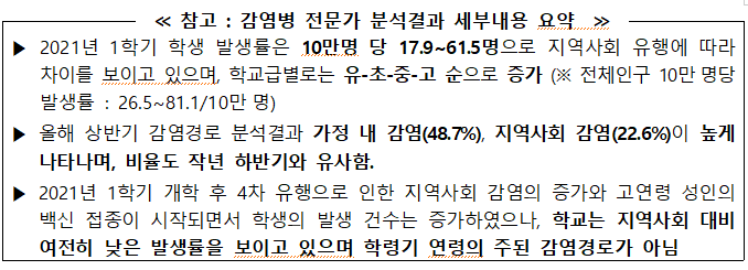 ▲ 올해 1학기 학교 코로나19 발생 관련 감염병 전문가 분석결과 요약. [출처=교육부] |