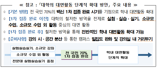 ▲ 대학의 대면활동 단계적 확대 방안 주요 내용. [출처=교육부] |