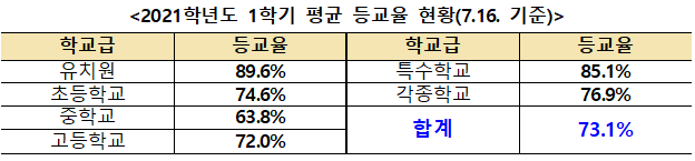 ▲ 2021학년도 1학기 평균 등교율 현황. [출처=교육부] |
