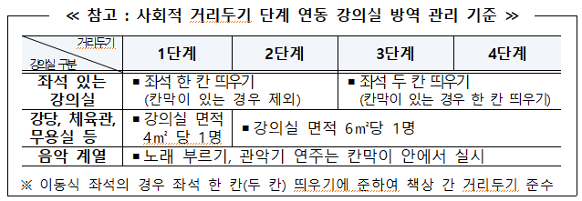 ▲ 사회적 거리두기 단계 연동 강의실 방역관리 기준. [출처=교육부] |