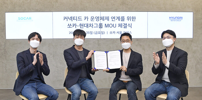 현대차는 지난달 25일 쏘카 서울오피스(서울시 성동구 소재)에서 현대차 추교웅 인포테인먼트개발센터장, 권해영 인포테인먼트개발실장, 쏘카 박재욱 대표이사, 류석문 CTO 등 양사 관계자들이 참석한 가운데 ‘커넥티드 카 운영체제 연계를 위한 업무 협약(MOU)’을 체결했다고 밝혔다.