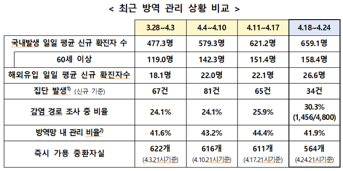 이에 따라, 정부는 거리두기 단계조정 전 1주간(4월 26일~5월 2일)을 특별 방역관리주간으로 지정해 증가세 반전을 꾀하겠다는 계획이다.