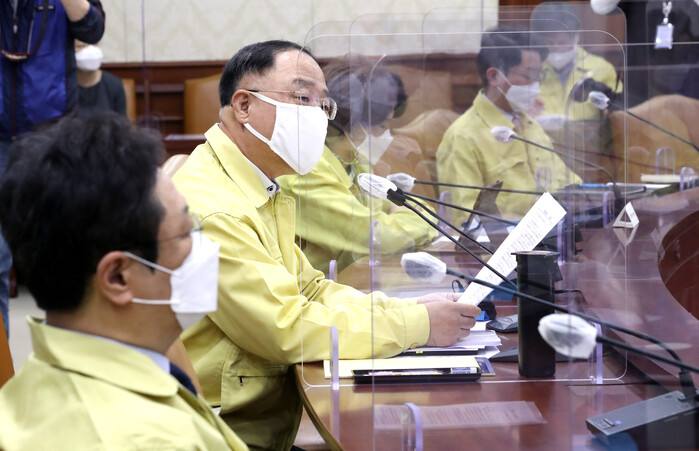 ▲ 홍남기 국무총리 직무대행이 25일 정부서울청사에서 열린 코로나19 대응 중앙재난안전대책본부(중대본) 회의에서 발언하고 있다. [사진= 연합뉴스] |