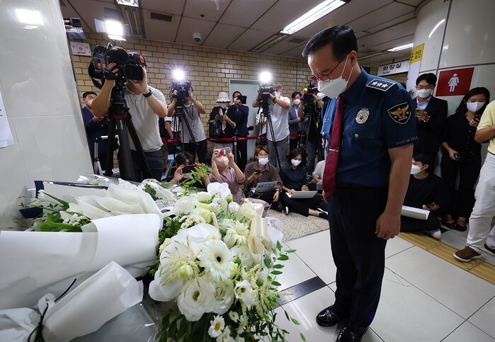 | ▲ 16일 김광호 서울경찰청장이 '역무원 스토킹 피살 사건'이 발생한 서울 지하철 2호선 신당역 여자화장실 입구에 마련된 추모공간을 찾아 묵념하고 있다. 이 자리에서 김 청장은 "엄정하고 신속한 수사를 통해 관련자 조사, 증거물 압수 등 혐의 구증과 함께 피의자 '신상공개위원회'도 최대한 신속히 개최하겠다"고 말했다. [서울=연합뉴스] |