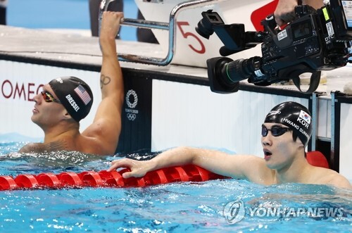 | ▲ 황선우가 29일 오전 일본 도쿄 아쿠아틱스 센터에서 열린 수영 남자 100m 자유형 결승전에서 경기를 마친 뒤 기록을 확인하고 있다. 황선우 왼쪽은 이날 경기에서 우승한 미국의 케일럽 드레슬. [도쿄=연합뉴스] |