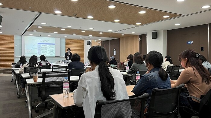 | ▲ 지난 27일 서울시 강남구 소재 신한아트홀에서 진행된 ‘디지털 두뇌건강강사 발대식’에서 강사들이 설명 듣는 모습. [사진=신한은행 제공] |