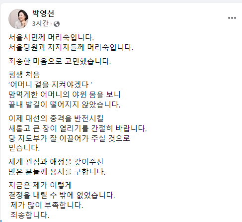 박 전 장관은 이날 페이스북에서 “서울시민께 머리숙인다. 서울당원과 지지자들께 머리숙인다”며 “지금은 제가 이렇게 결정을 내릴 수 밖에 없었다”고 이같은 사실을 확인했다.