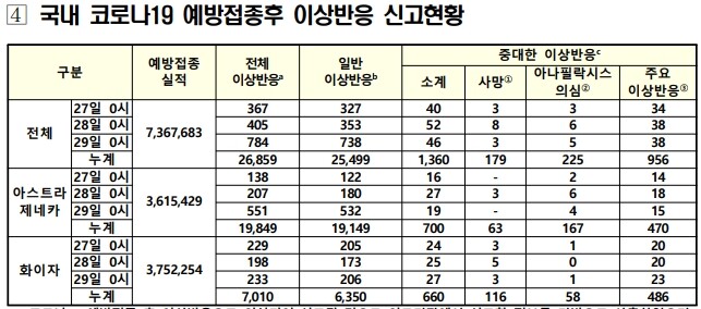 중증 전신 알레르기 반응인 아나필락시스 의심 사례는 신규 14건 포함 총 225건(0.84%), 주요 이상반응 사례는 신경계 이상반응 등이 신규 110건 포함해 956건(3.56%), 사망 사례는 신규 14건 포함 179건(0.67%)이 신고됐다고 추진단은 밝혔다.