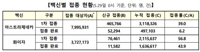 백신별로는 아스트라제네카(AZ) 백신의 전날 하루 1차 신규 접종은 46만5766명, 2차 접종 완료자는 5만2294명이다. 누적 수치로는 AZ 접종대상자 799만5931명 중 1차 접종은 311만8326명(접종률 39.0%), 2차 접종 완료는 49만7103명(접종률 6.2%)이다.