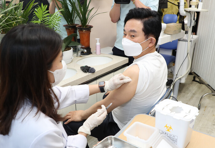 ▲ 원희룡 제주지사가 28일 오후 제주보건소에서 아스트라제네카(AZ)사의 코로나19 백신 1차 접종을 하고 있다. [제주도 제공] |