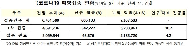 국내 신종 코로나바이러스 감염증(코로나19) 백신 접종이 93일째를 맞이한 29일 전국민 접종률은 10.2%, 2차 접종률은 4.2%를 각각 기록했다.