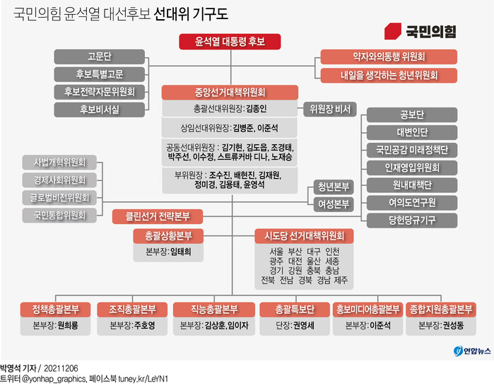 ▲ 국민의힘 윤석열 대선후보 선대위 기구도. [그래픽=연합뉴스] |