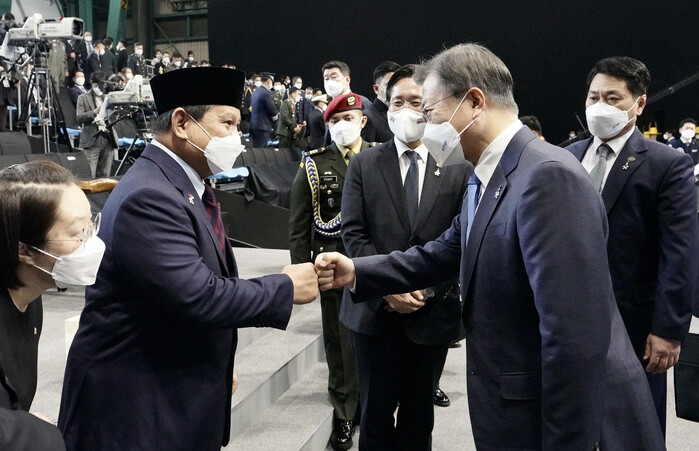 ▲ 문재인 대통령이 9일 한국형전투기(KF-X) 시제기 출고식에 참석, 프라보워 수비안토 인도네시아 국방부 장관과 인사하고 있다. [사천= 연합뉴스] |