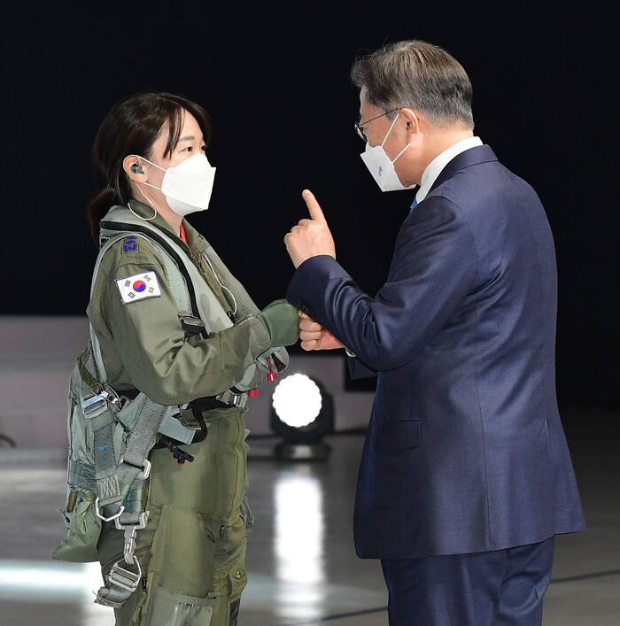 ▲ 문재인 대통령이 9일 한국형전투기 보라매(KF-21) 시제기 출고식에서 보라매 탑승자 양윤영 대위를 격려하고 있다. [사천= 연합뉴스] |