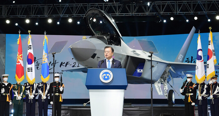 ▲ 문재인 대통령이 9일 경남 사천시 한국항공우주산업(KAI) 고정익동에서 열린 한국형전투기 보라매(KF-21) 시제기 출고식에서 기념연설을 하고 있다. [사천= 연합뉴스] |